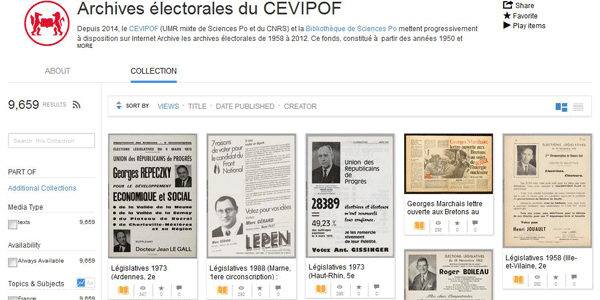 Depuis 2014, le CEVIPOF (UMR mixte de Sciences Po et du CNRS) et la Bibliothèque de Sciences Po mettent progressivement à disposition sur Internet Archive les archives électorales de 1958 à 2012. Ce fonds, constitué à partir des années 1950 et toujours enrichi, rassemble le matériel électoral publié à l’occasion d’élections en France et diffusé auprès des électeurs.