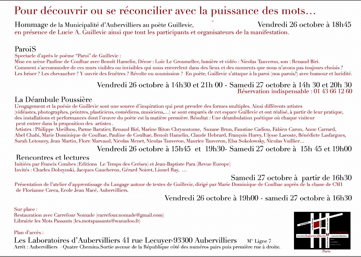 La Tribu-Collectif Poussière et La municipalité d’Aubervilliers rendent hommage au poète Guillevic les vendredi 26 et samedi 27 octobre 2007 aux Laboratoires d’Aubervilliers.