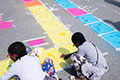 Au pochoir, patiemment, Sylvie Da Costa imprime au sol son Victory Garden. Soit, des dizaines de carrés multicolores, agencés en formes de chemins, conçus avec une graphiste.