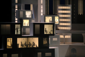 Les Somnambules offrent un voyage dans une ville en mouvement. Un vieux quartier promis à la démolition laisse place à une ville moderne déshumanisée. Au fil des nuits, quand la cité s’endort, les habitants rêvent. Leurs songes se répercutent sur la ville, l’animent et la métamorphosent en un lieu de tous les possibles. Cette histoire est mise en scène dans une maquette spectaculaire animée par des jeux d’ombres et de lumières, terrain de jeu pour quatre marionnettistes et deux musiciens.