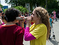 Bien vues ces pièces au format d’un quart d’heure chacune : le public, les mômes et les promeneurs se sont laissés aspirer et ont suivi les comédiens dans leur déambulation.