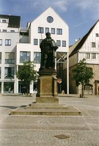 Würdevoll steht er auf seinem Sockel, mit einer aufgeschlagenen Bibel und einem Schwert in der Hand trotz er mit Ruhe allem Treiben auf dem Platze.
